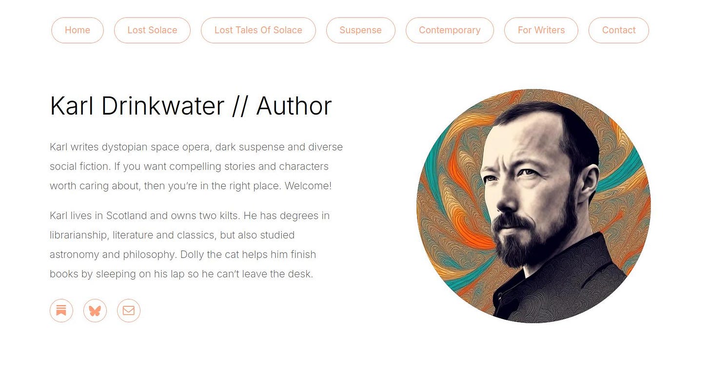 I have gone for brighter colours and no scrolling. Here’s a link to it. I’m also in the process of setting it up so you can buy ebooks and audiobooks from my page, adding things to a cart and buying a number of items at once, if you like. It’s not perfect, but after adding something it should be possible to “Continue shopping” and get back to my home page. I also plan to add some paperbacks, and maybe even hardbacks, so everything can be bought in one transaction. I’ll see how far I can get with that over the weekend. I’ve only added one paperback so far, for Lost Solace.